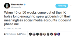 On July 19th, 2017, Bassnectar tweeted "When 40 or 50 wooks come out of their K holes long enough to spew gibberish off their meaningless social media accounts it doesn't phase me." [8]Many thought that Bassnectar was going after his own fan base, in which a noticeable and loud portion of which consists of wooks.