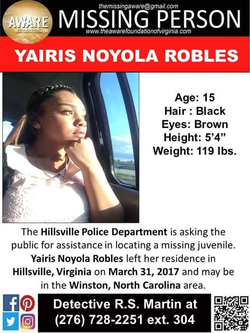 On March 31st, Robles ran away from home and is reportively headed to the Winston, North Carolina area. She is Mexican and is listed as 5'4'', weighs 115 lbs, has black hair and brown eyes. Anyone with any information is urged to call Detective R.S. Martin at 276-728-2251.
