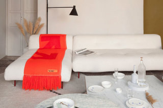 "BED" offers a coconut-white double bed set, embroidered with the brand’s ARROWS logo in black. The category also includes an orange tassel-knit throw blanket.