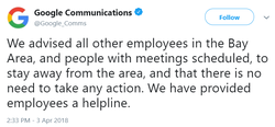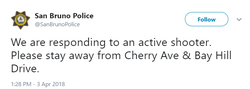 On Tuesday, April 3, 2018, at 12:46 p.m., the San Bruno Police Department received numerous 9-1-1 calls reporting gunshots at the YouTube Campus located at 901 Cherry Avenue in San Bruno. *San Bruno Police Officers arrived on scene at 12:48pm and immediately entered the building to search for a possible suspect.