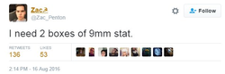 Citation Linkywqaugeunhowzrcj.public.blob.vercel-storage.com"I need 2 boxes of 9mm stat" - Zac's tweet on August 16 at 2:14 PM