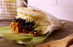 Citation Linkywqaugeunhowzrcj.public.blob.vercel-storage.comArepa with carne mechada (marinated shredded beef), caraotas negras (black beans), and queso de mano (Imported Venezuelan Goat Cheese).