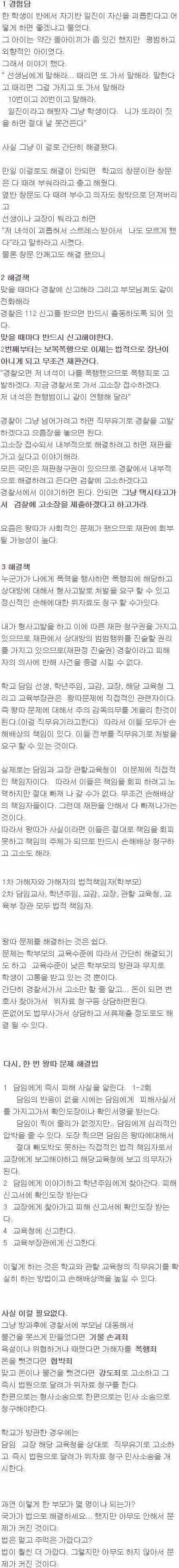 학교 문화, 대화법, 또래상담 지원, 학부모 소환, 위클래스 상담, 학폭, 혹은 경찰서에 고소/고발, 혹은 학폭위를 교육지원청/교육청 등으로 이관.